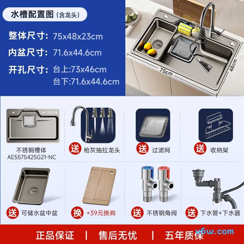 材质:304不锈钢 工艺:焊接 是否含龙头:含龙头 水槽样式:单槽 产品尺寸:长750mm,宽460mm,高220mm 参考价格:¥983.33